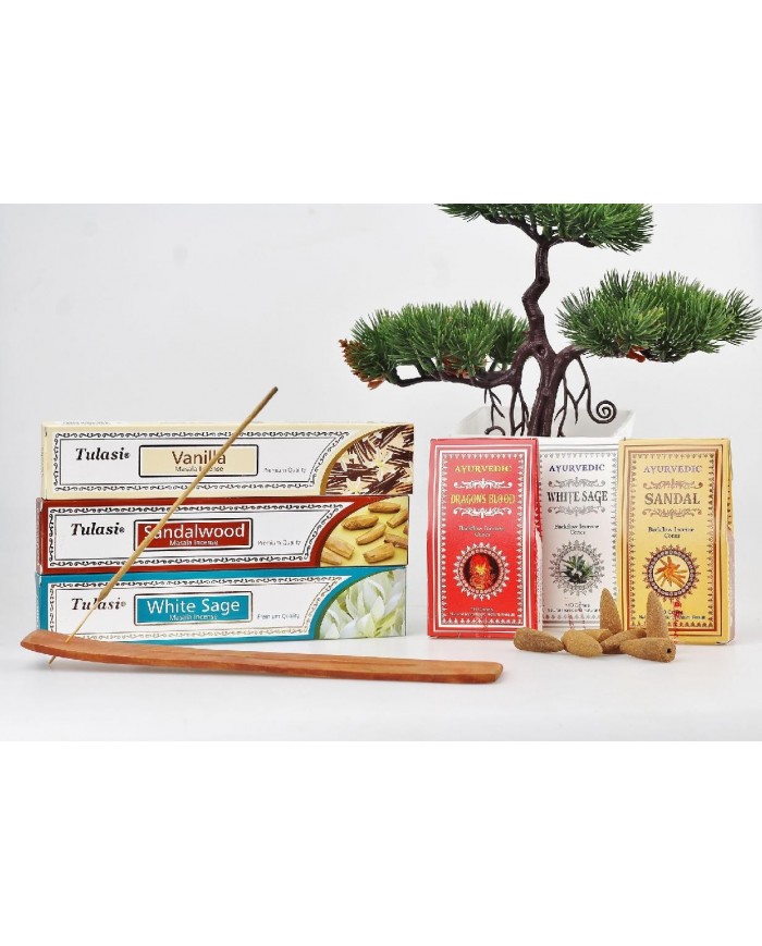 Sada vonné tyčinky Tulasi 3x + vonné kužely Ayurvedic - Tekutý dým 3x + stojánek