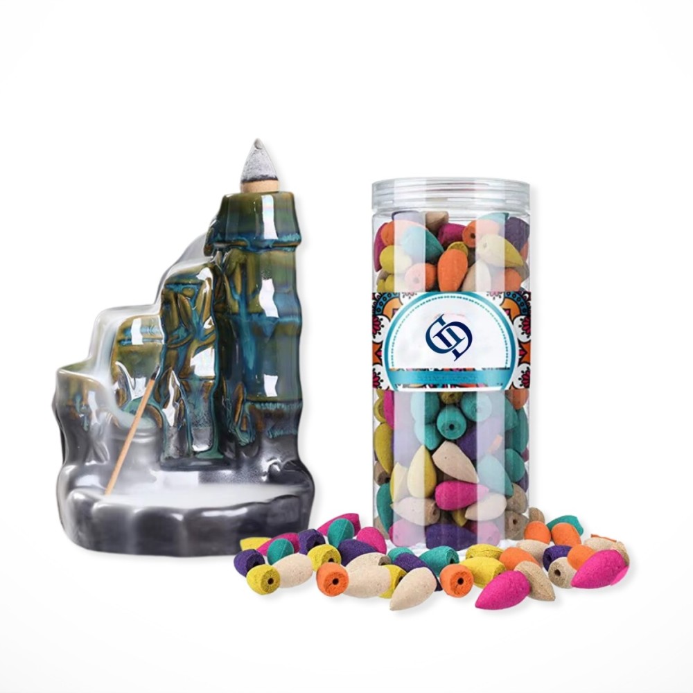 Sada difuzéru s efektem "tekoucího dýmu" a balení vonných kuželů je ideální pro kohokoliv, kdo se chce unést řadou vůní a jejich blahodárnými účinky, začátečníky zapalování vonných kuželů, milovníky aroma kuželů či pro praktikanty jógy a meditace. Mimo jiné je tato sada báječným dárkem. Difuzér byl navržen speciálně na vonné kužely a jejich zapálení vytvoří fascinující efekt. Kouř vonného kužele se line po stojanu, prochází jeho skulinkami a vytváří tzv. "tekoucí dým“. Každá vůně má lehce jiné blahodárné účinky. Obecně vonné kužely vaše tělo a mysl zrelaxují a uvolní, vymažou negativní energii v místnosti a jsou výborným pomocníkem při meditaci či józe. Mnoho aroma kuželů také působí antistresově a zlepšuje spánek. Díky naší sadě můžete vůně střídat podle libosti, potřeb a nálady.