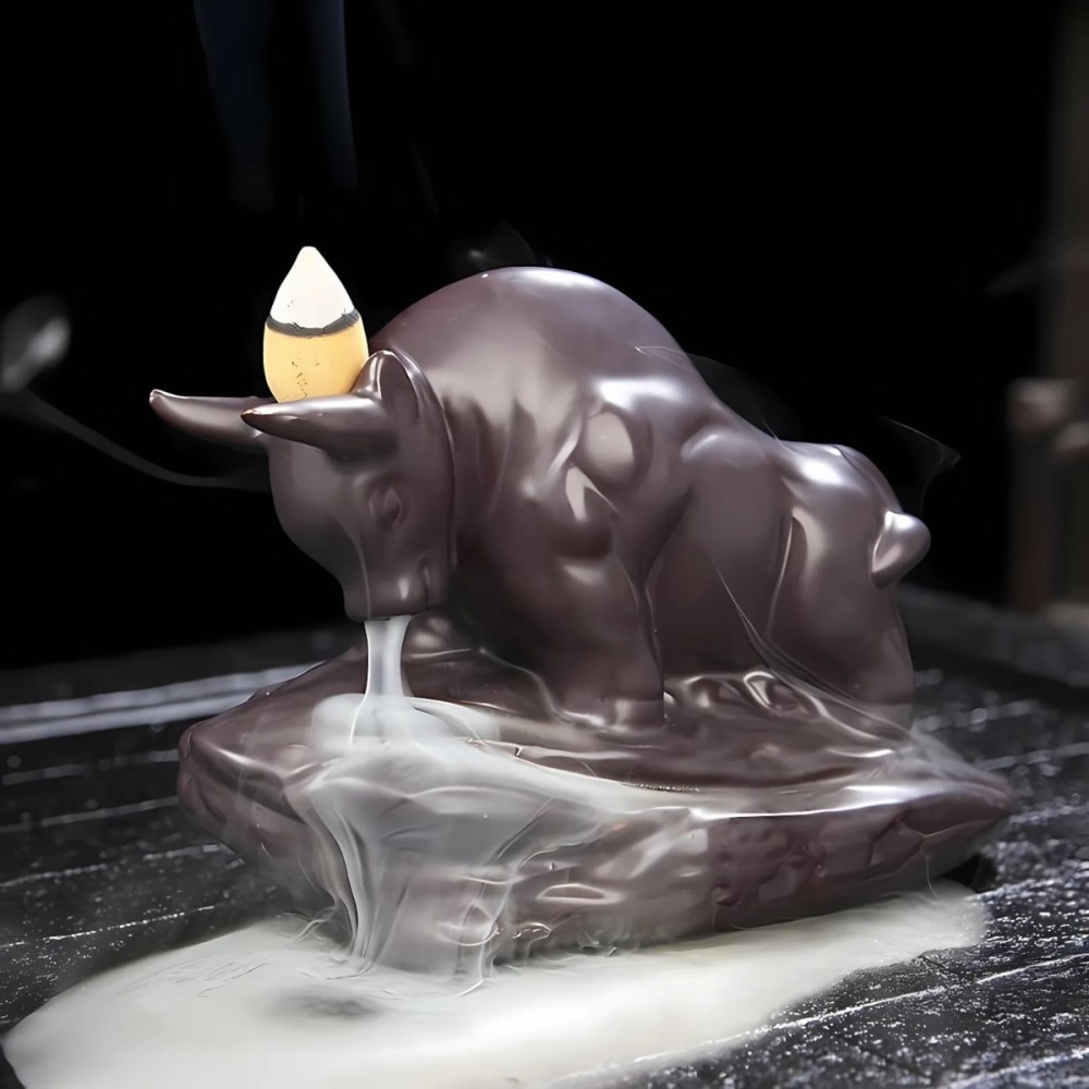 Tento unikátní stojan na vonné kužely ve tvaru býka nabízí harmonické propojení síly a elegance. Precizně zpracovaná soška býka slouží jako ideální doplněk k vytvoření klidné atmosféry ve vašem domově. Po zapálení vonného kuželu kouř jemně proudí po hlavě býka a vytváří vizuálně poutavý vodopádový efekt, který se usazuje na základně stojanu.
